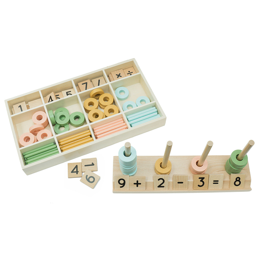 The Path to Math has never been so easily paved, and is so much fun, kids won’t even know they are learning! Our set comes complete with 48 color rings for stacking, 80 color coordinated sticks for counting, 24 numeric tiles with letters on the reverse side, 8 equation tiles, and a 5 ring stacker, all inside of a natural wood storage box. From the very young to school age children, Path to Math helps teach equations, counting, color matching, spelling and more. Get on the right path!