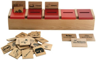 This solid hardwood Classification Learning Center consists of a 5 compartment sorting box with 10 category wood tiles and 100 wood object tiles to sort by class. The child can start with one or two categories and work up to sorting 5 categories at a time. Answers are easily checked by removing sorted tiles from each compartment and comparing them to the category guide tile. An additional, unlimited number of object tiles can easily be made by using cut-outs of objects from newspapers, magazines, coloring books, etc.