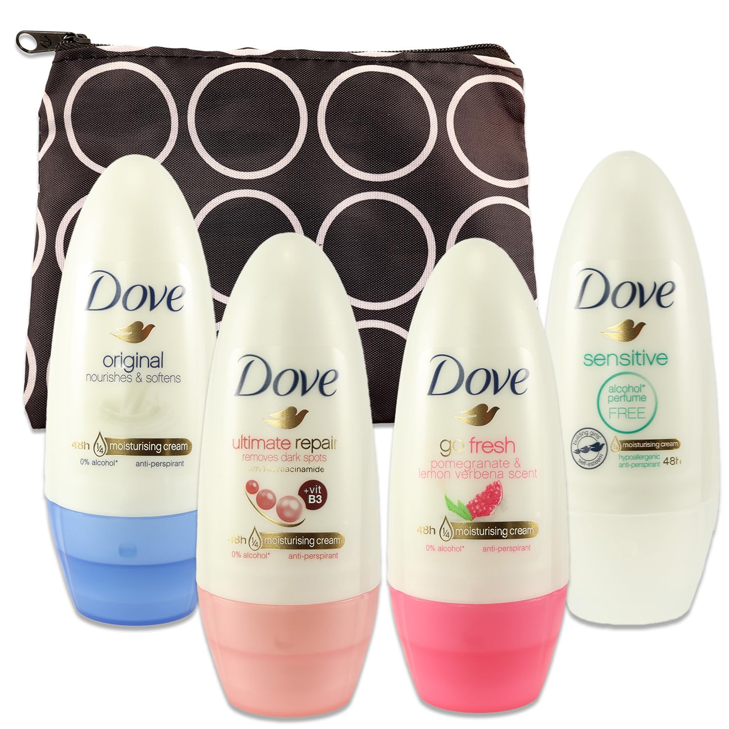 Dove Roll on Deodorant Variety Pack - Dove Deodorant Variety Pack Bundle with 4 Travel Size Deodorant Dove Roll On with 1.4 oz Plus Travel Bag | Original, Fresh Scent, Sensitive Skin, Ultimate Repair