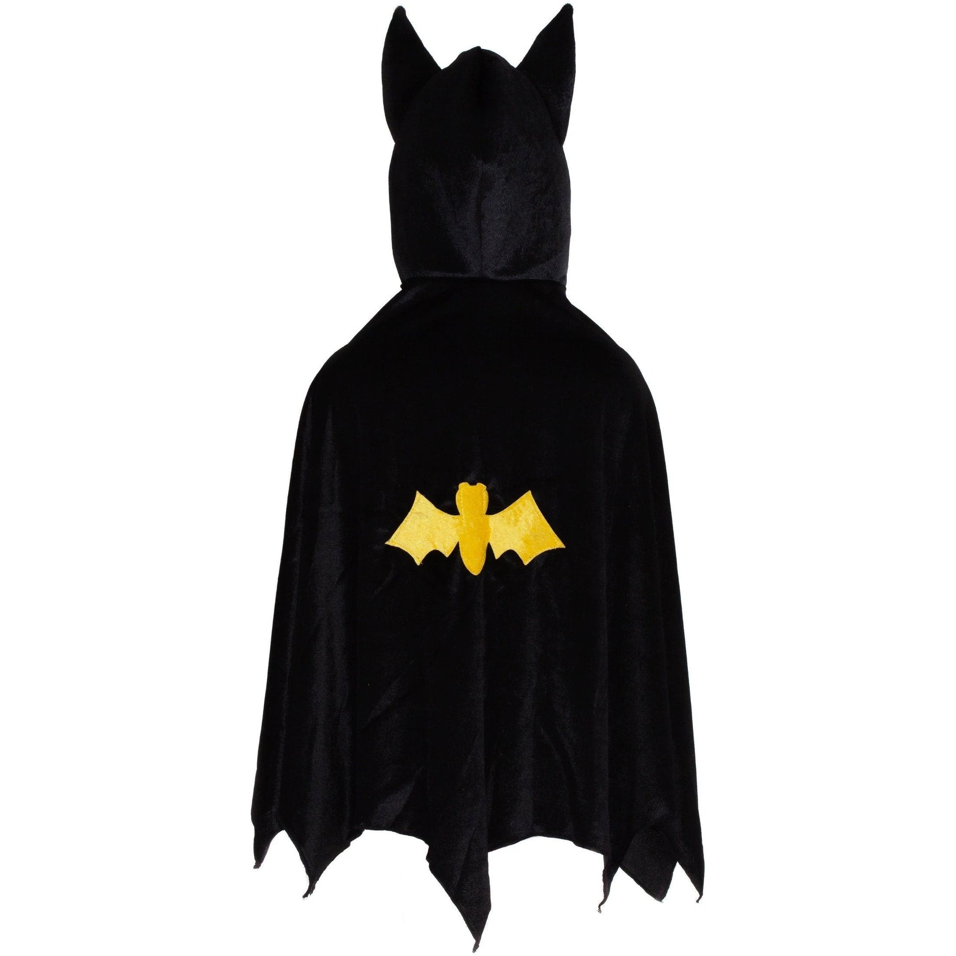 Ready superhero fans! This hooded bat cape features large bat ears on the hood and an awesome bat emblem on the back of the cape. The cape is made from soft velour fabric and is cut like real bat wings with a scalped edge. This made in Canada cape will have you set for many superhero adventures.