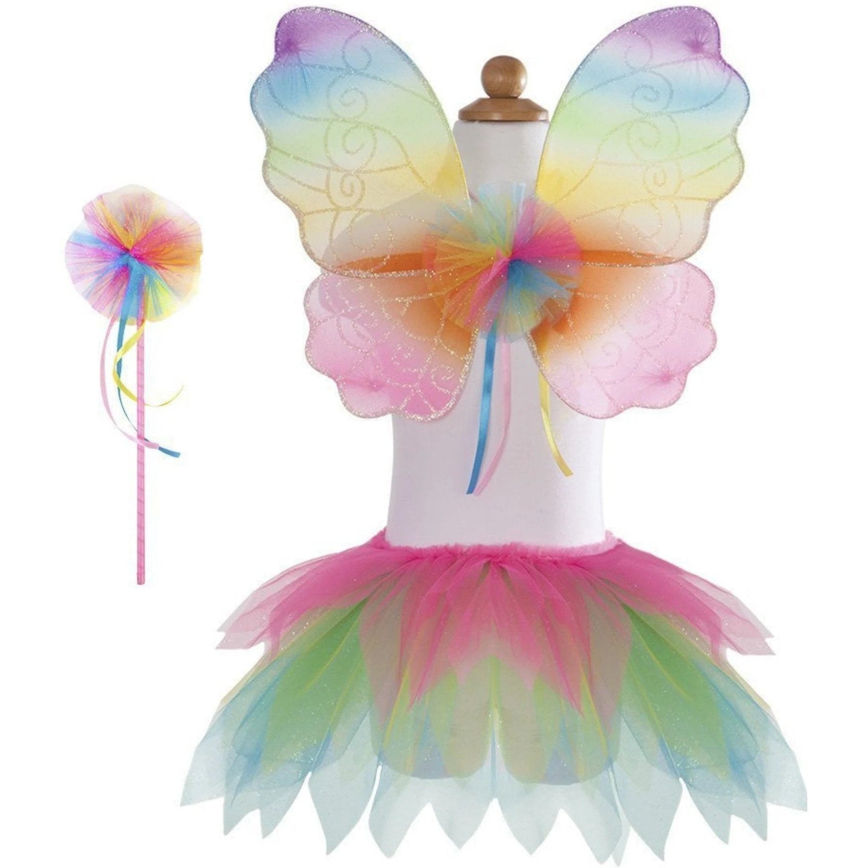 Somewhere over the rainbow you'll find the perfect tutu, wing and wand set! This skirt set is made from soft glitter tricot tulle cut to be petal perfect. The matching rainbow wings feature an amazing glitter print that is sure to sparkle and the rainbow wand finishes this Technicolor treat with matching soft tulle and multicolored ribbons. This three piece set is the perfect addition to play time fashion!