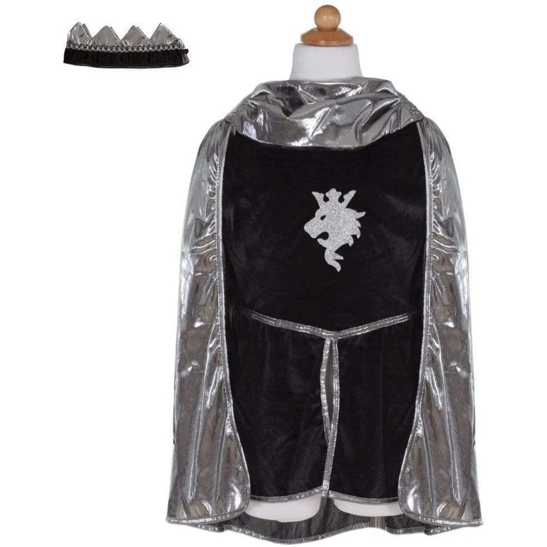 Be off to fight the good fight with this amazing 3 piece gold hooded knight set. This set includes a hooded tunic, knight cape, and gold or silver knight crown. A glitter lion emblem is embellished on the front of a black velour tunic with chainmail-like fabric for the hood and long sleeves. The Velcro on and off cape made out of gold or silver liquid knit adds to complete the outfit. Plus don't forget the last piece, the matching knight crown trimmed with gold or silver detailing!