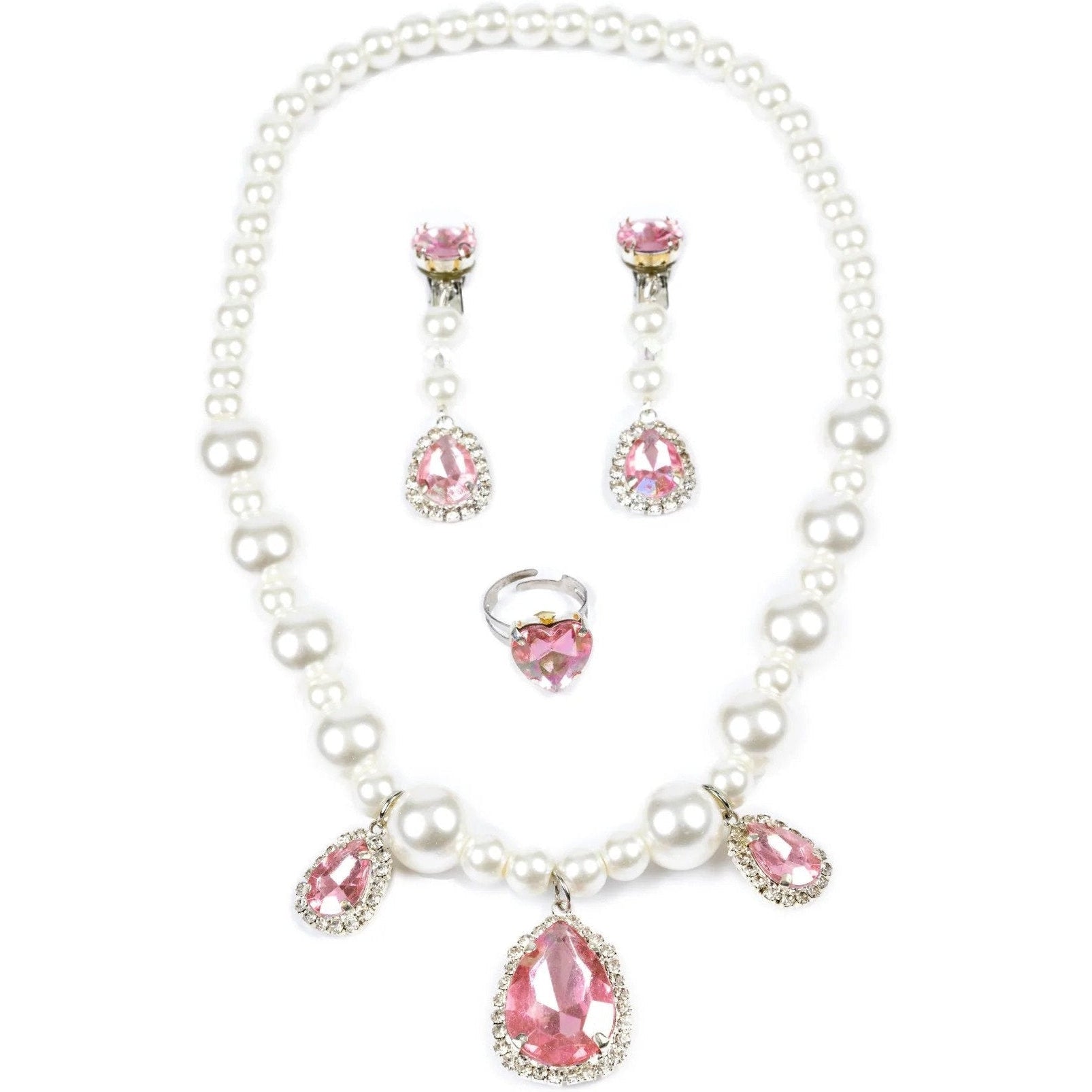Bold pink gems pair with soft and elegant pearls in The Coco 4-piece jewelry set. This beautiful boxed-set includes dangly clip-on earrings, a heart-shaped ring, and a coordinating pearl necklace with jeweled tear-drop charms.