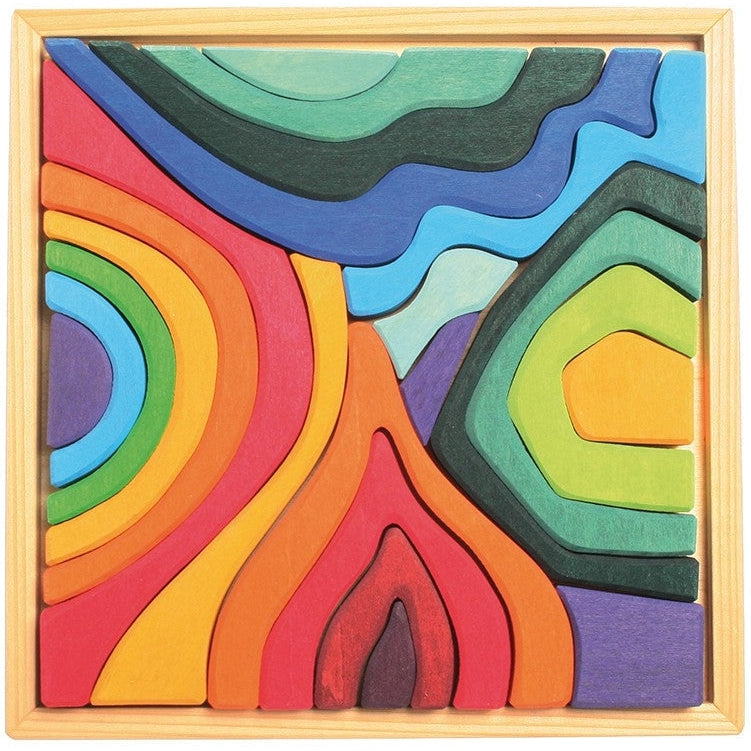 The ancient Four Elements—Earth, Air, Fire and Water—are represented in this colorful wooden puzzle set with a cave, a rainbow, flames and a wave.