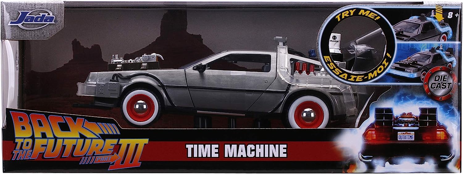 Travel back to the Old West with one of the most iconic vehicles in the Hollywood Rides line-up: the Time Machine as seen in "Back to the Future Part III\" (1990). Featuring a die-cast body, rubber tires and light-up feature, this 1:24 scale vehicle is a must have in any collection!