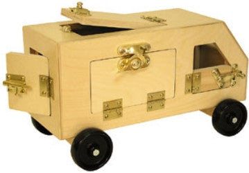 A sturdy hardwood vehicle that combines imaginative play with learning how to manipulate latches. With six different doors and latches, the child can lock and unlock, load and unload, and make deliveries all over town.