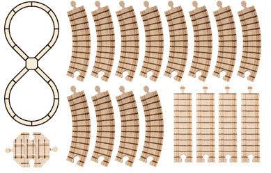 This set includes 12 large curve track pieces, 4 8-inch straight track pieces and 1 crossover. The straight track and crossover are grooved on one side and the curved track is grooved on both sides so they can be used in either direction. All tracks are laser engraved with stripe detail.