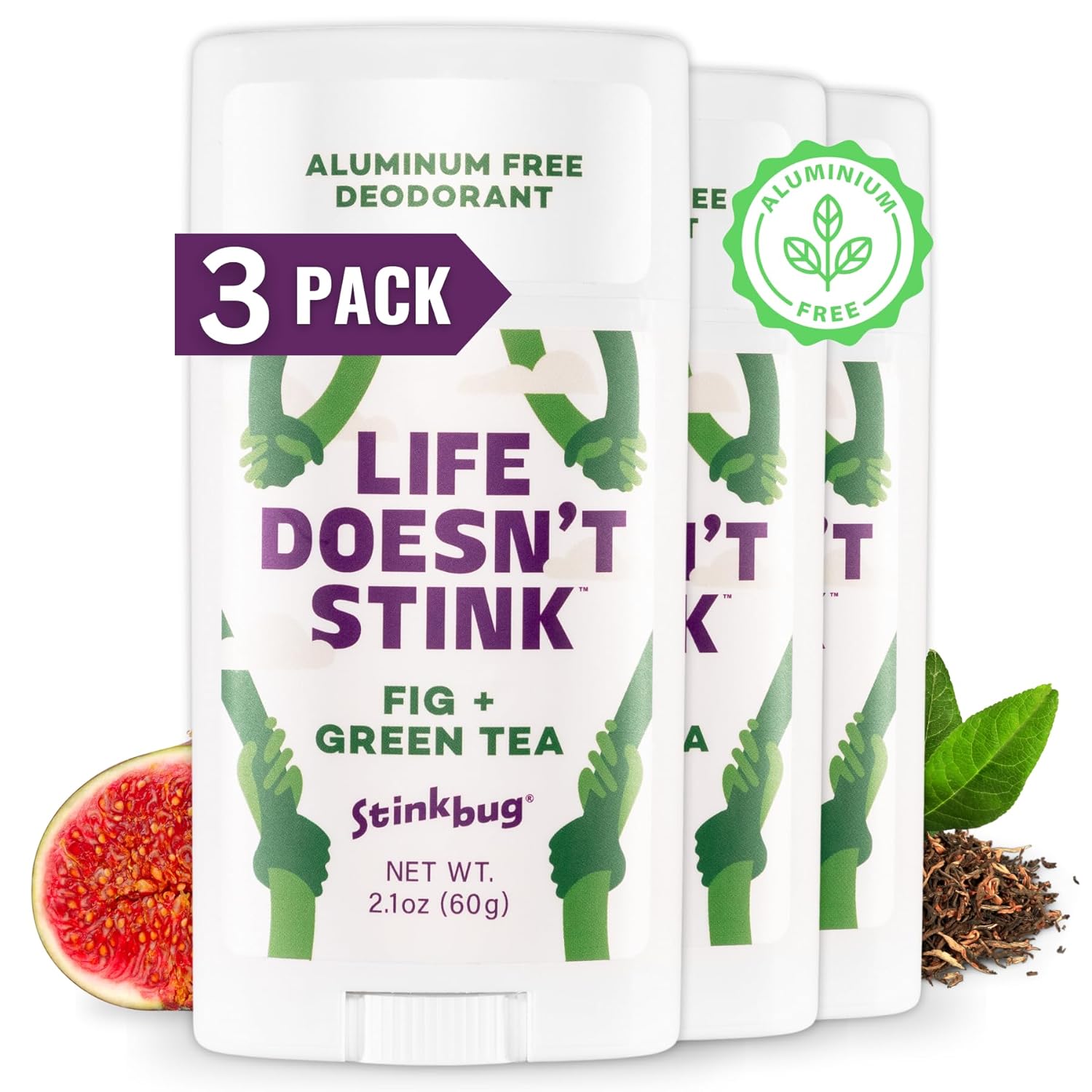Natural Organic Deodorant Stick with Fig + Green Tea, Coconut Oil and Activated Charcoal, Aluminum Free Deodorant by Stinkbug Naturals, 2.1 Ounce Pack of 3