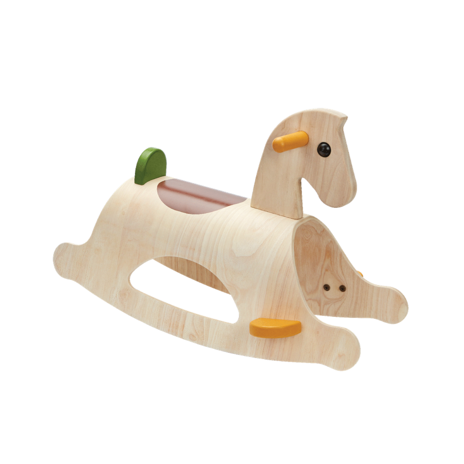 The PlanToys Palomino rocking horse is now available in the modern rustic colorway. It comes with a saddle and is built on parallel rockers so children can rock back and forth. - Built on parallel rockers for easy rocking back and forth - Safety stops are built in to prevent child from rocking to far forward or backward. - Comes with a built-in saddle and colorful accent.