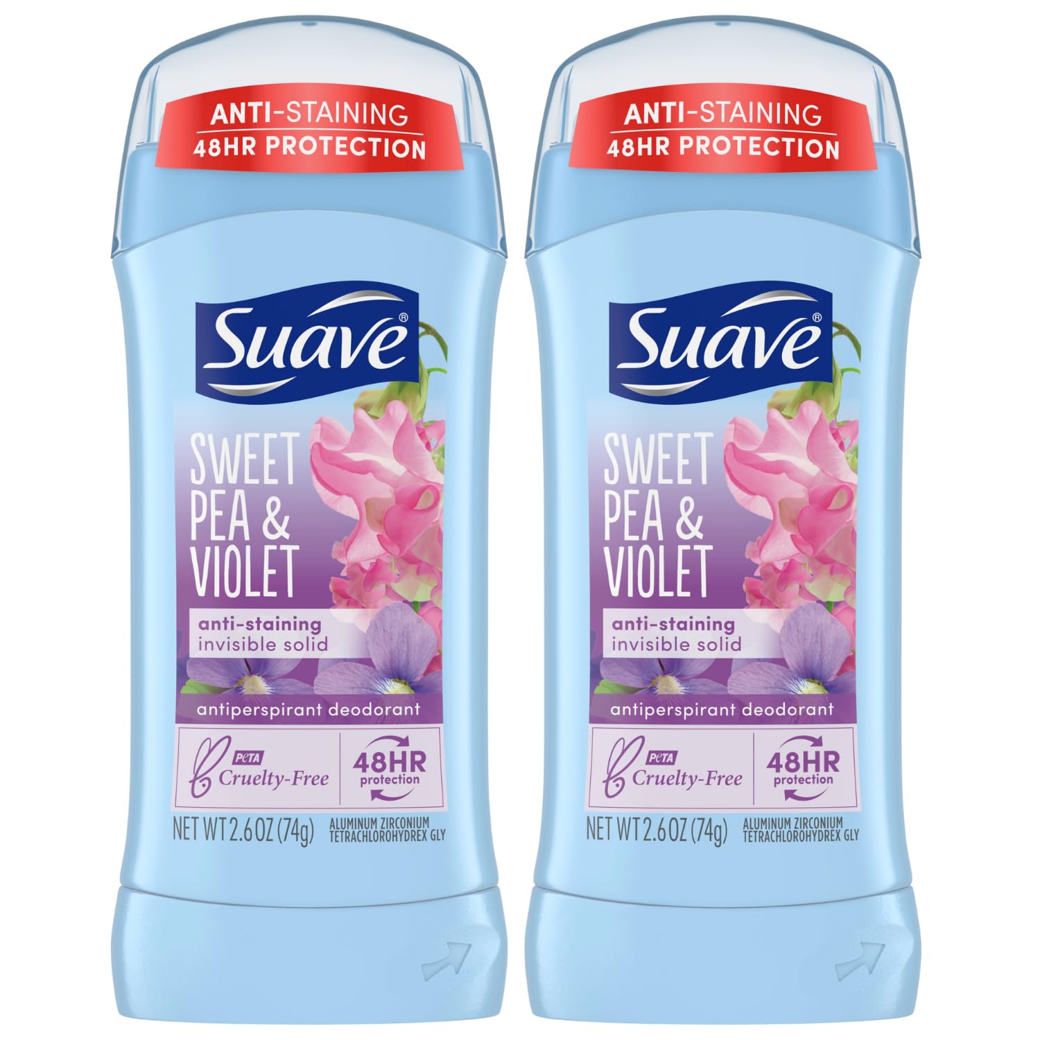 Suave Deodorant for Women, Sweet Pea & Violet – Invisible Solid Antiperspirant Deodorant Stick, 48H Protection, Anti-Staining, Cruelty-Free, Scented, 2.6 Oz (Pack of 2)