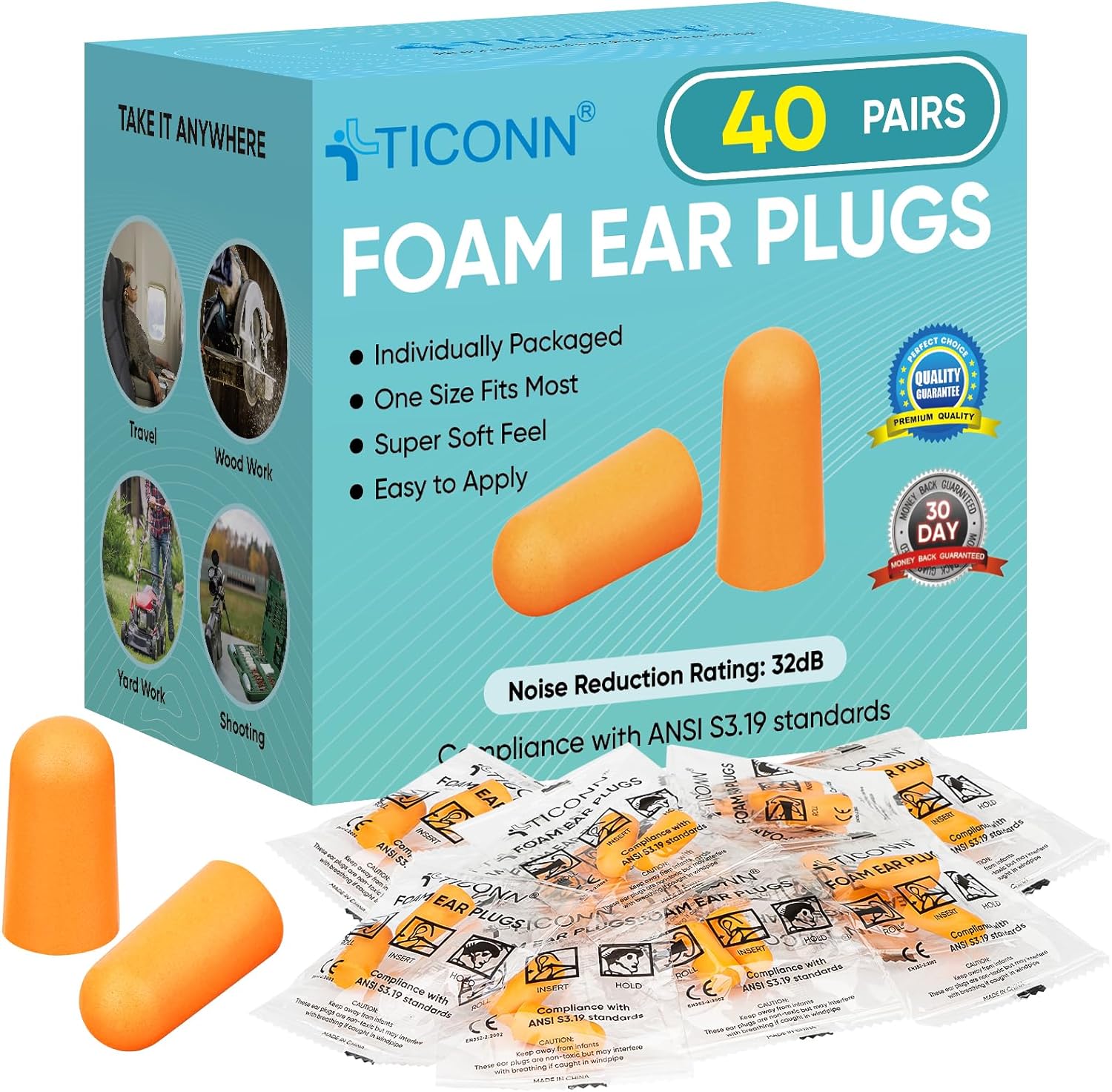 [EFFECTIVE NOISE REDUCTION] TICONN Foam ear plugs are designed to provide effective noise reduction. They can reduce noise levels by up to 32 decibels, making them ideal for use in noisy environments such as construction sites, traveling, and other industrial workplaces which require hearing protection.