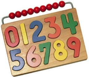 A number puzzle plus. This number puzzle consists of large, brightly colored numbers that are thick and raised above the surface of the puzzle board making it easy for the child to remove the numbers and fit them back correctly. A trademark of the TAG number puzzles is the counting beads which are permanently attached to the puzzle. This allows the child to count out a concrete quantity of beads and associate it with the numerical symbol.